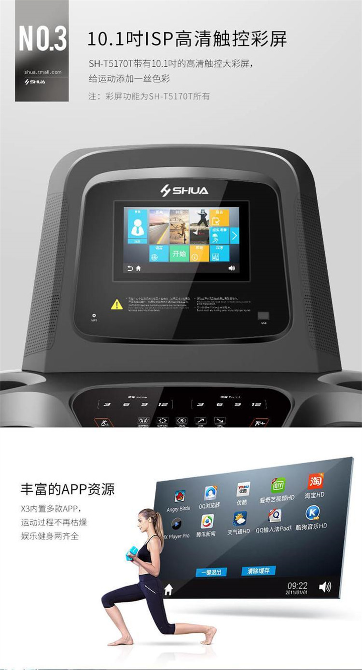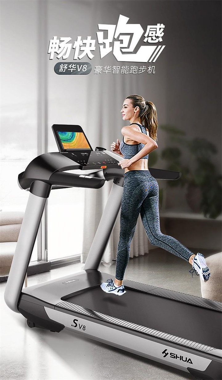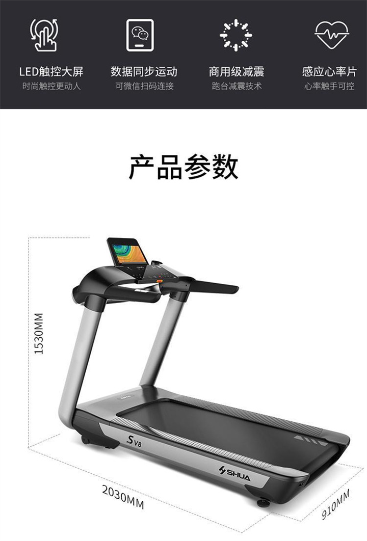 智能商用万搏买球官方网站 SH-T8919T-Y50(V1+)采用T2.2mm黑钻纹(可选配:T2.4免维护跑带)的跑带,选用手握心率测试 自带心率带及增加心率控速(HRC)程序模块测量心跳等数据,跑步宽度达580mm,可承受180kg的使用者使用。