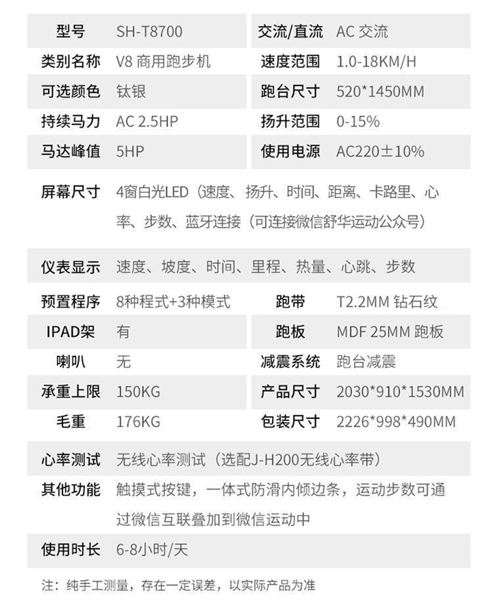 舒华商用万搏买球官方网站 SH-T860(V6)采用商用大跑台,手握心律测试,全跑台减震护足的设计,对您跑步中的膝盖进行全方位的呵护,选用手握式感应片测心率等数据,跑步面积达580×1570mm,可承受180kg的使用者使用。