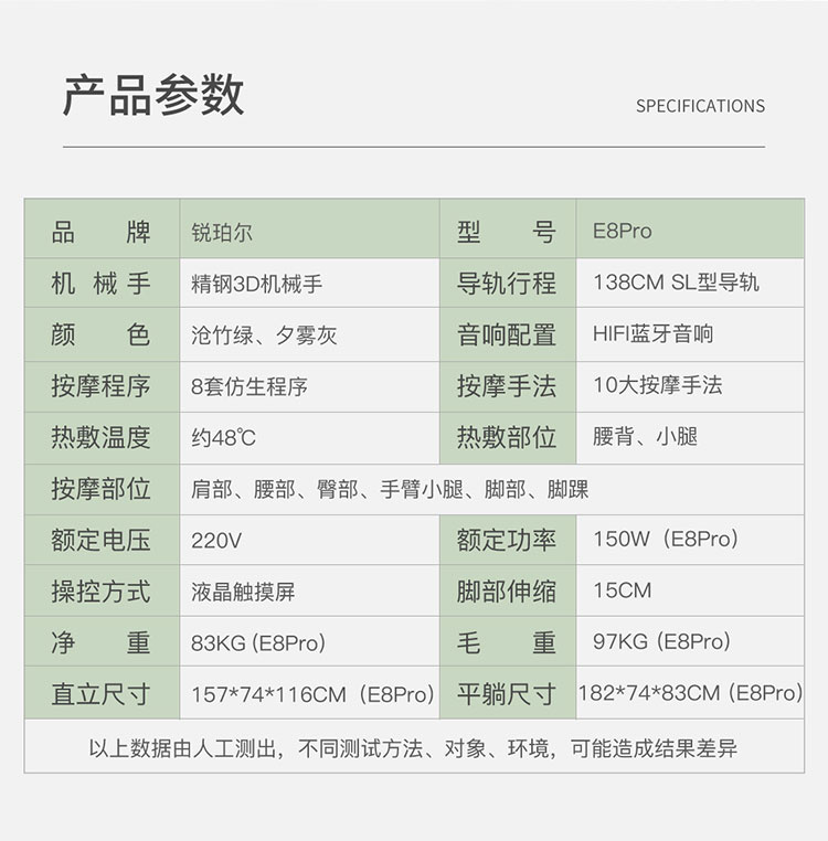 • 产品简介:锐珀尔新品按摩椅E8 Pro拥有温感养生系统,3D摆揉机械手,十大按摩手法,138cm超长SL按摩导轨,腿足一体按摩等功能,并且有无线充的一款新品按摩椅,价格不贵,重在享受。