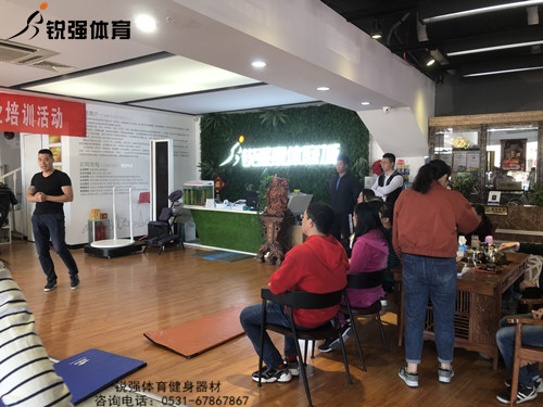 首先,张康教练就各项健身器材的功能、适用做了简单的介绍,其中提到,锐强体育作为一家专业的健身器材公司,每一位锐强人都必须拥有一副好身体,好体格,这样才能让自己的客户拥有信任感,这就是一个很好的开始;有了信任感,再了解客户的具体需求,包括购买的健身器材是谁在用,身体状况如何,年龄等等各方面的因素,只有了解了专业、扎实的健身知识,才能为顾客提供专业的私人订制健身器材的采购意见,也才能更好的为客户提供私人定制专业的健身意见,并强调:没有一件健身器材就可以练全身的,有氧运动和力量器械、柔韧训练需要同时兼顾,才能让我们的身体处于一种非常好的健康状态。