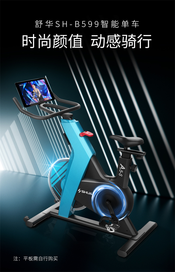 锐强体育推荐健身器材-舒华动感单车SH-B599采用三角形车架搭配工字底座的稳定结构设计,骑行更稳定,承重可达125kg,手动磁控阻力设计,骑行时无物理摩擦,更顺畅静音,同时无需插电,使用更便捷。13kg磁控飞轮,足量均质,保障骑行时的惯性力及动平衡,骑行劲爽。