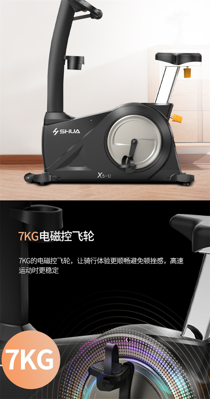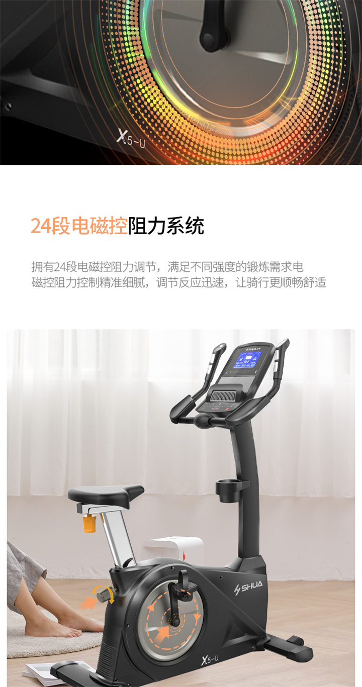 舒华卧式商用健身车SH-B9100U(V10)采用自发电,40段电磁控阻力系统,9.3kg飞轮重量。
