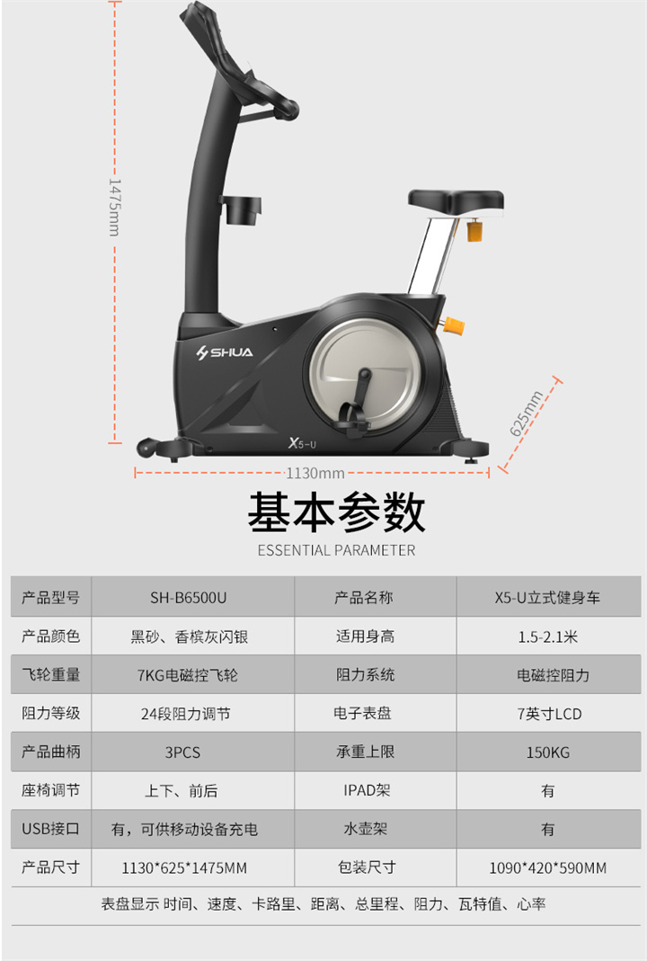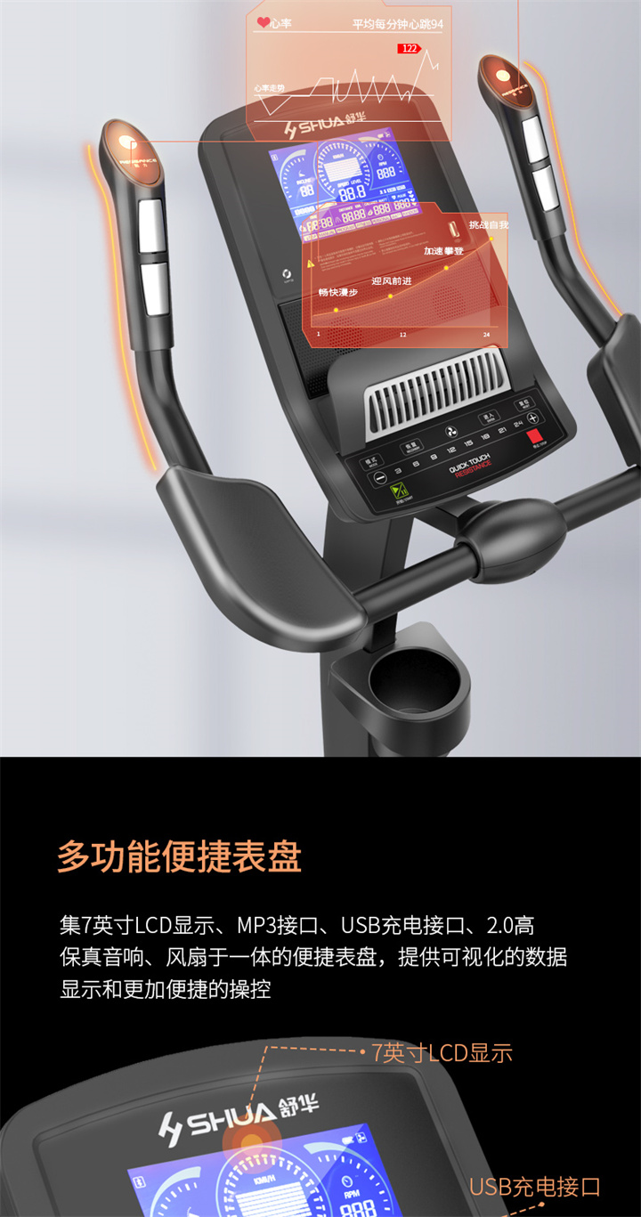 舒华立式商用健身车SH-B9100U(V10)触屏版拥有超大显示和操作屏幕, 可以任意设置阻力、时间和距离等参数,还可以即时显示心跳和转速等数据,同时,SH-B9100U提供多项科学运动处方,更轻松掌握运动节奏。