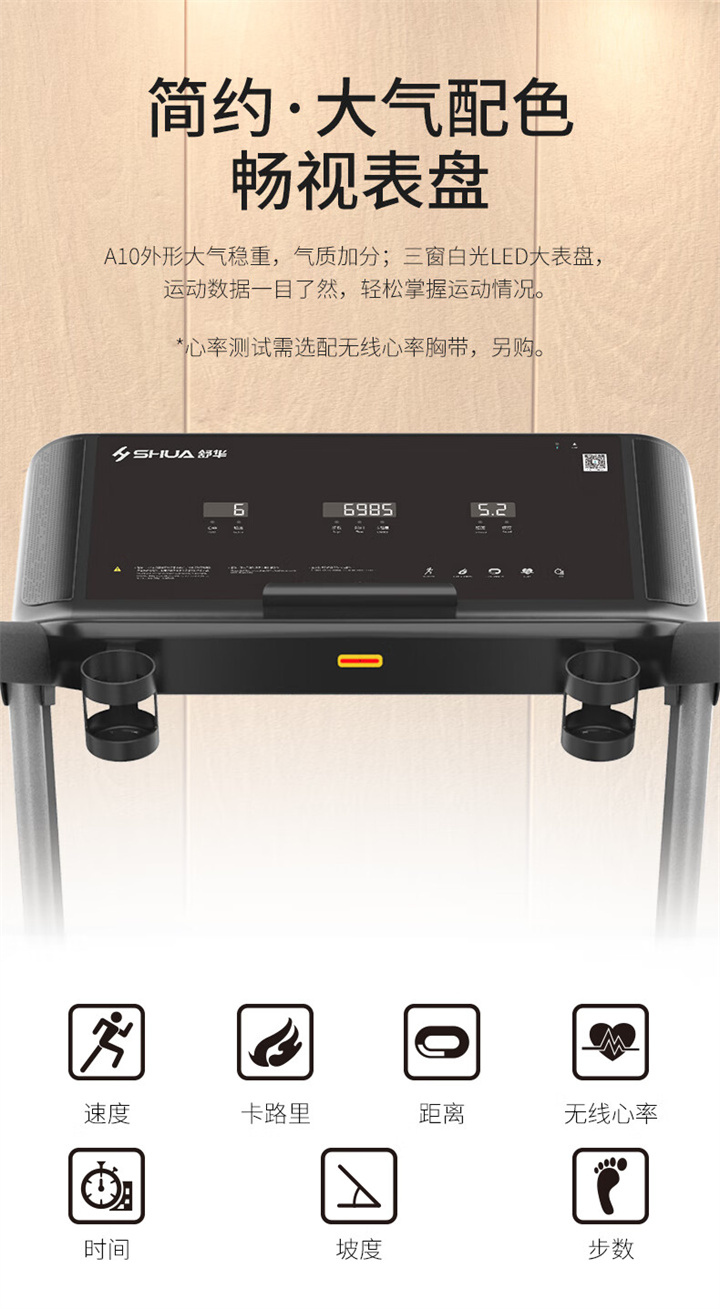 舒华家用万搏买球官方网站 SH-T6700(X6)采用18T+12T双层跑板,T2.2mm钻石纹的跑带,双层跑板全跑台减震,对您跑步中的膝盖进行全方位的呵护,选用接触式心率感应和无线心率感应等多种方式获取数据,跑步面积达520×1450mm,可承受130kg的使用者使用。