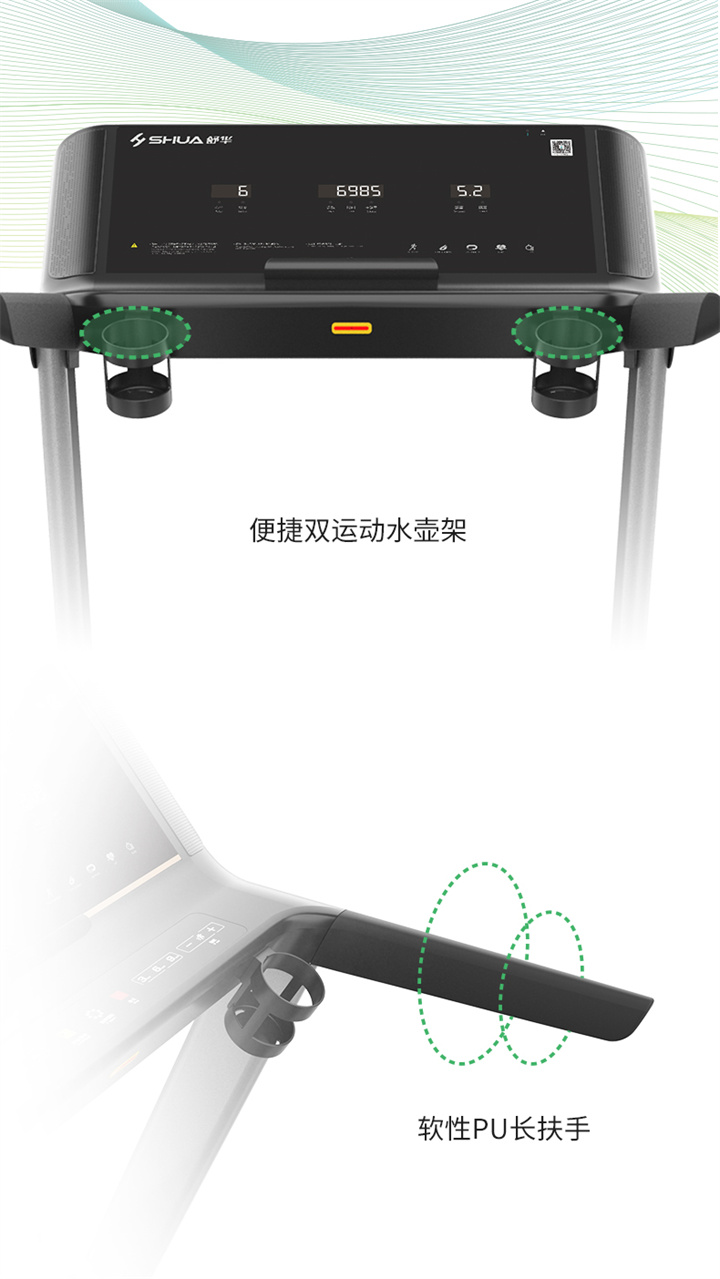 锐强体育推荐健身器材-舒华商用电动万搏买球官方网站 SH-T6500拥有10.1寸IPS高清触摸屏、Z型动感时尚外观设计、70×150mm精钢立柱机身、F级高效静音马达、520mm商用豪华跑带和35mm双层全跑台减震跑板等优势,让您享受科学跑步。