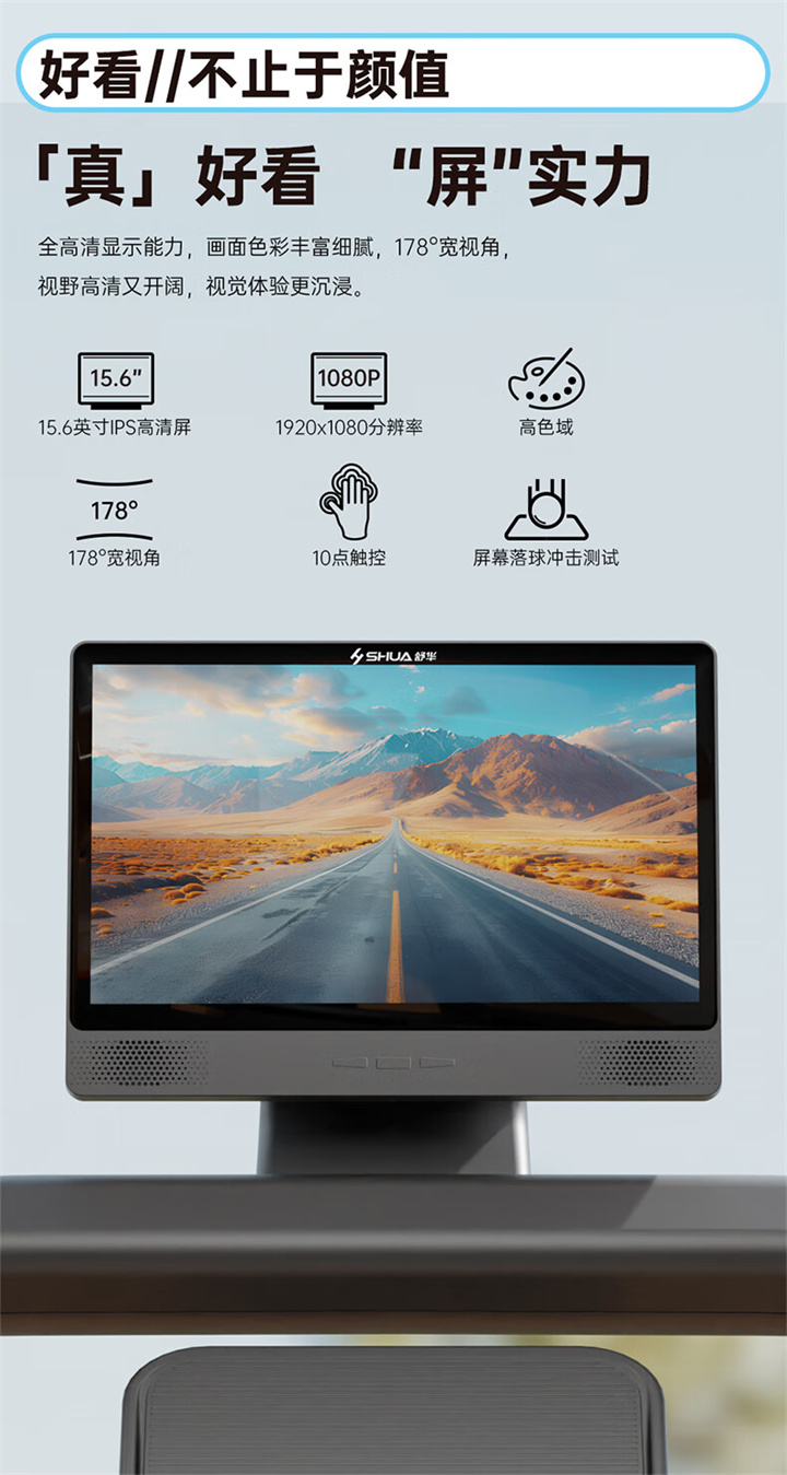 锐强体育推荐健身器材-舒华商用电动万搏买球官方网站 SH-T6500拥有10.1寸IPS高清触摸屏、Z型动感时尚外观设计、70×150mm精钢立柱机身、F级高效静音马达、520mm商用豪华跑带和35mm双层全跑台减震跑板等优势,让您享受科学跑步。
