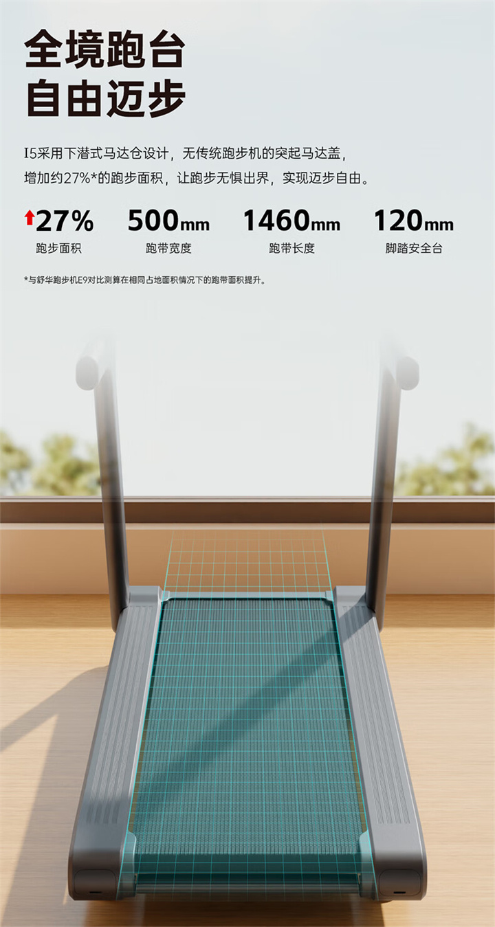 舒华家用万搏买球官方网站 SH-T5100持续马力达1.25HP,具有500×1350mm的跑台,运用无线心率接收模块监测心率,运用6位硅胶减震设计,最大承重是126kg,可以满足大多数家庭的使用。